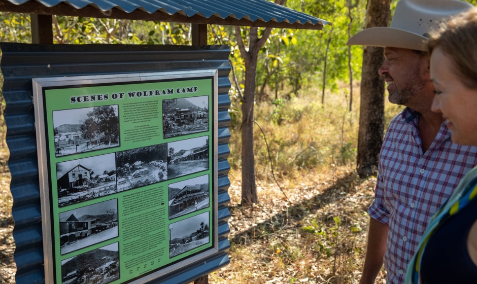 Set in a beautiful mountain valley, visitors will find a memorial erected by the Mareeba Historical Society as well as a sign with images and the history of the old town. Walk along the road (which was the main street of Wolfram) and follow a trail of metal signs indicating where the hotels, church and general stores once stood.
